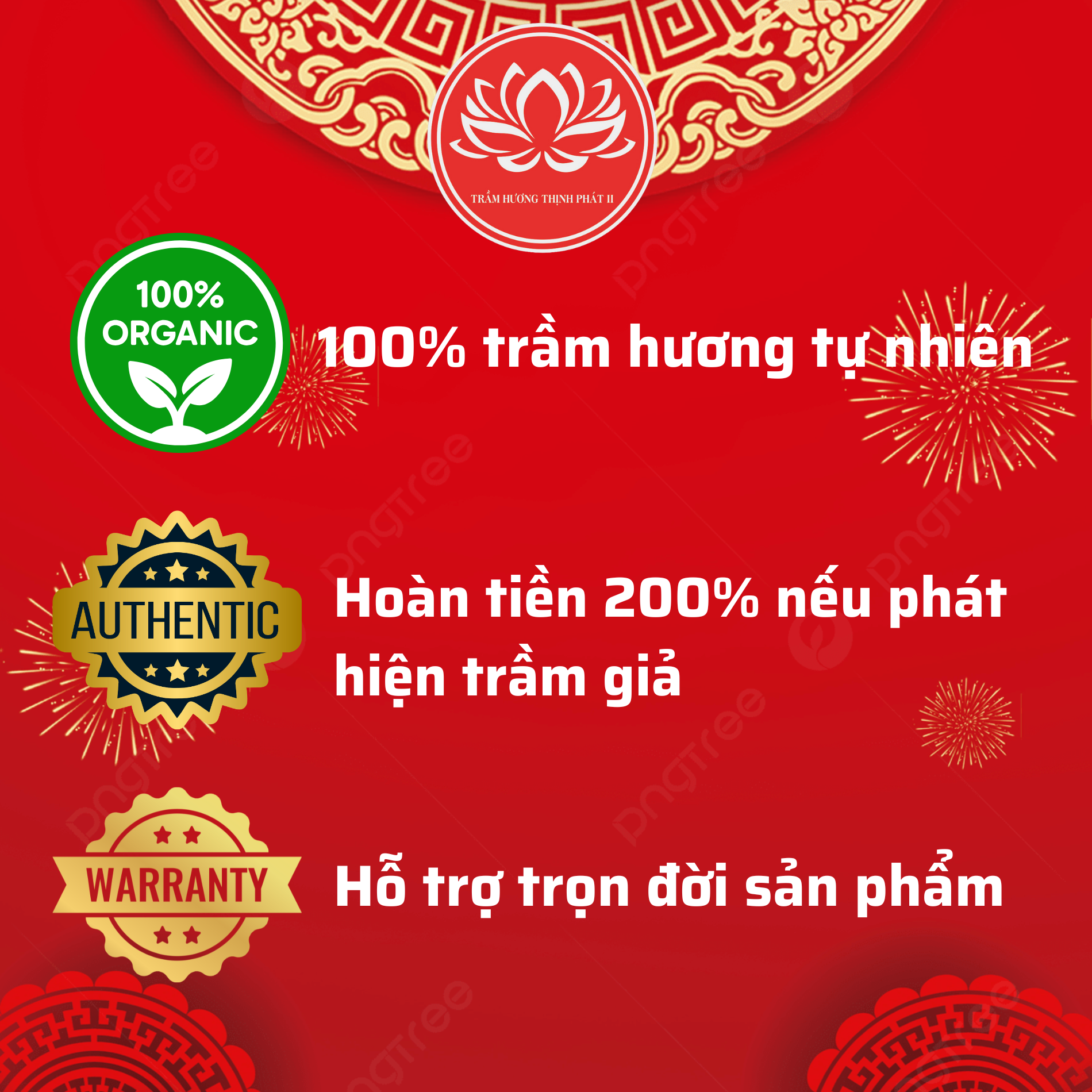 Bảo Hành Trọn Đời: Cam kết Bảo hành sản phẩm trọn đời đối với các lỗi kỹ thuật của nhà sản xuất. Bảo hành Vĩnh Viễn thay dây đối với các sản phẩm vòng trầm.